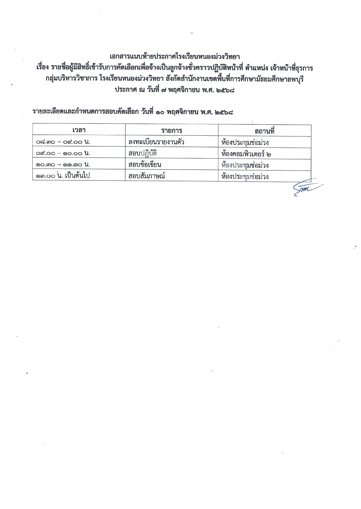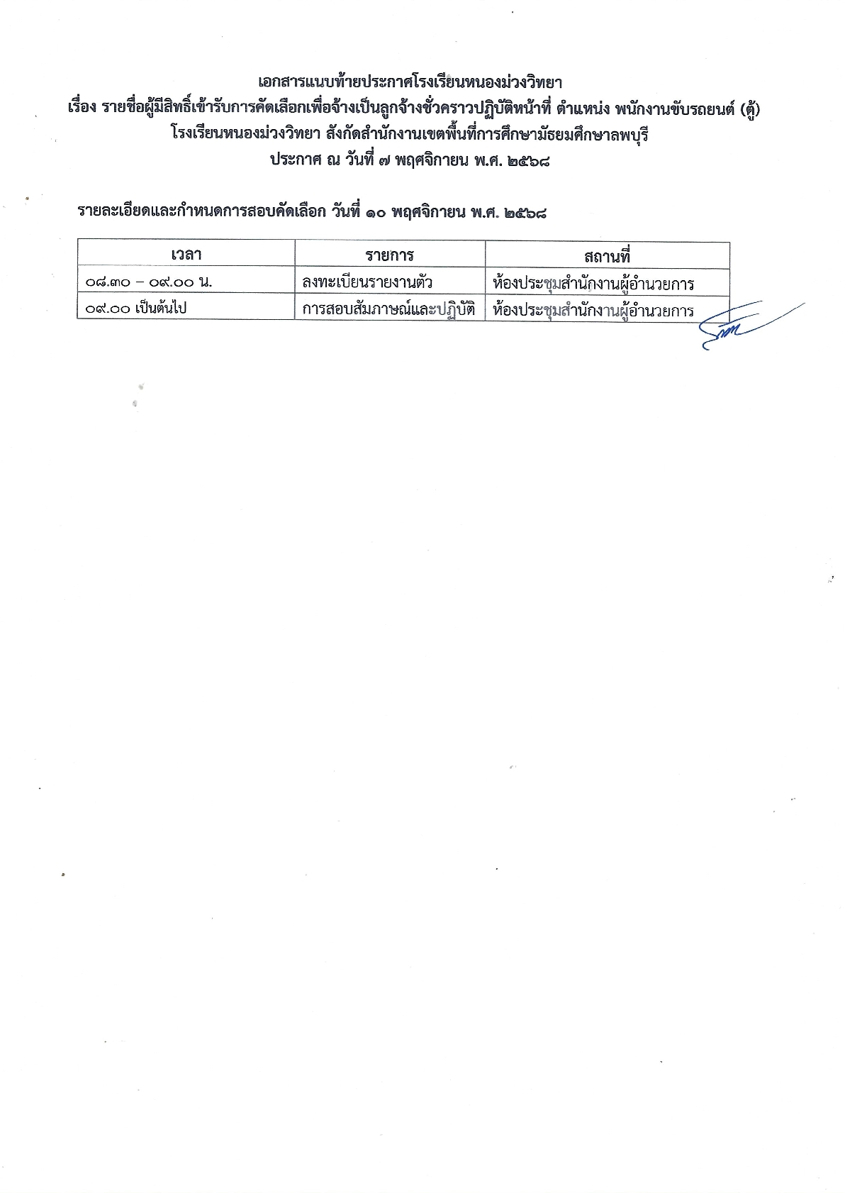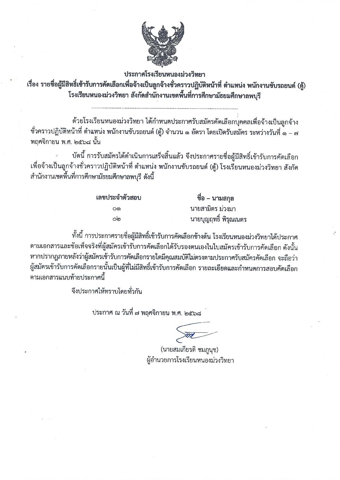 บัดนี้ การรับสมัครได้ดำเนินการเสร็จสิ้นแล้ว จึงประกาศรายชื่อเข้ารับการคัดเลือก เพื่อจ้างเป็นลูกจ้างชั่วคราวปฏิบัติหน้าที่ ในตำแหน่ง เจ้าหน้าที่ธุรการ กลุ่มบริหารวิชาการ และตำแหน่ง พนักงานขับรถยนต์(ตู้) โรงเรียนหนองม่วงวิทยา สังกัดสำนักงานเขตพื้นที่การศึกษามัธยมศึกษาลพบุรี ดังนี้