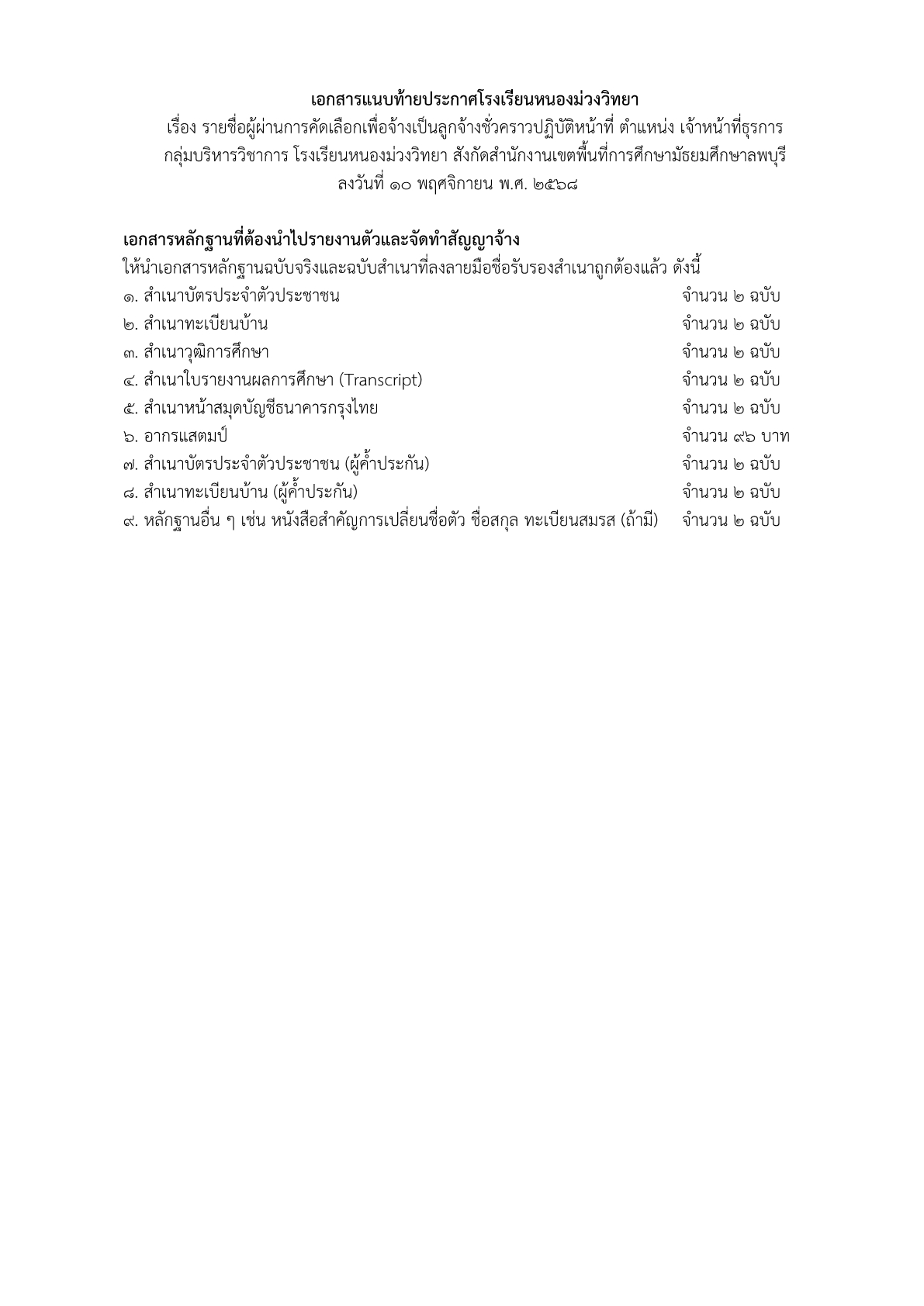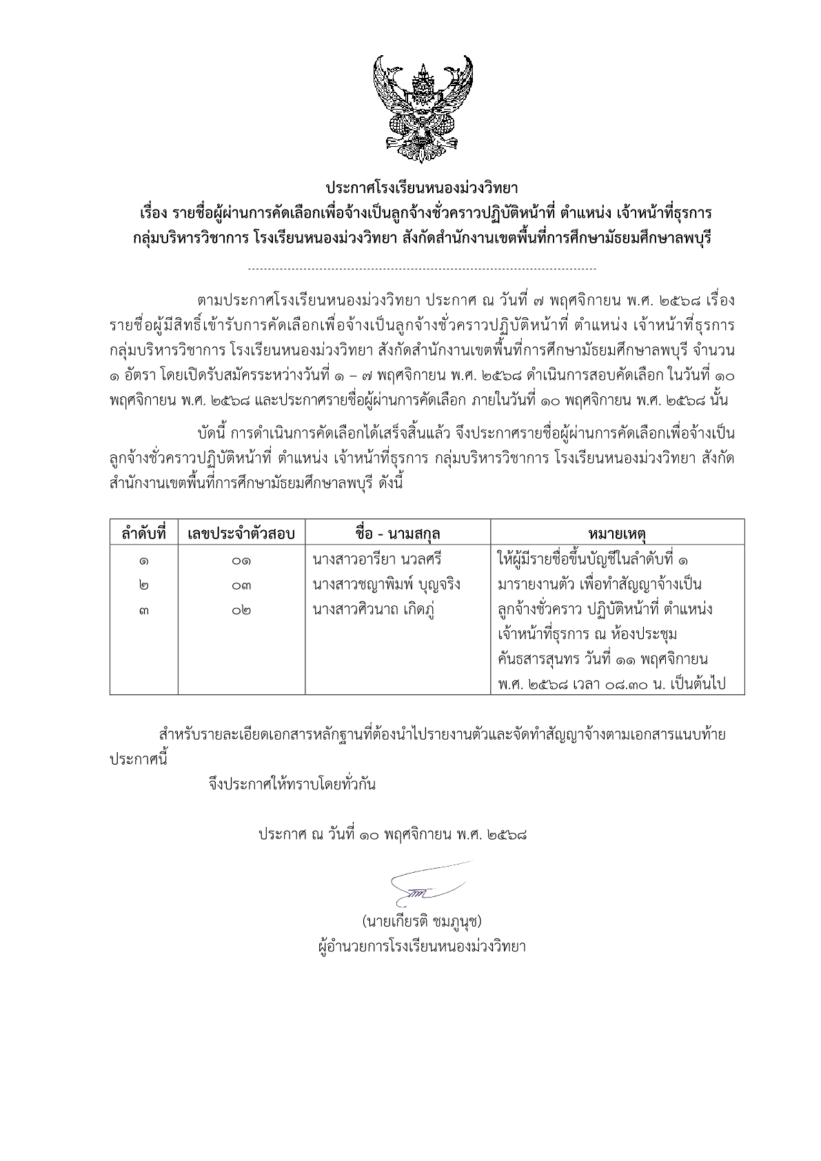 ตามประกาศโรงเรียนหนองม่วงวิทยา ประกาศ ณ วันที่ 7 พฤศจิกายน พ.ศ. 2568 เรื่อง รายชื่อผู้มีสิทธิ์เข้ารับการคัดเลือกเพื่อจ้างเป็นลูกจ้างชั่วคราวปฏิบัติหน้าที่ ตำแหน่ง เจ้าหน้าที่ธุรการ กลุ่มบริหารวิชาการ โรงเรียนหนองม่วงวิทยา สังกัดสำนักงานเขตพื้นที่การศึกษามัธยมศึกษาลพบุรี จำนวน 1 อัตรา โดยเปิดรับสมัครระหว่างวันที่ 1 – 7 พฤศจิกายน พ.ศ. 2568 ดำเนินการสอบคัดเลือก ในวันที่ 10 พฤศจิกายน พ.ศ. 2568 และประกาศรายชื่อผู้ผ่านการคัดเลือก ภายในวันที่ 10 พฤศจิกายน พ.ศ. 2568 นั้น