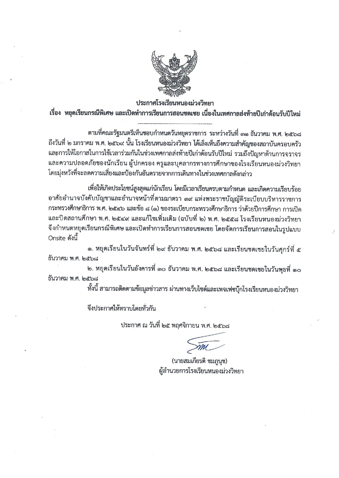 ประกาศโรงเรียนหนองม่วงวิทยา เรื่อง หยุดเรียนกรณีพิเศษ และเปิดทำการเรียนการสอนชดเชย เนื่องในเทศกาลส่งท้ายปีเก่าต้อนรับปีใหม่