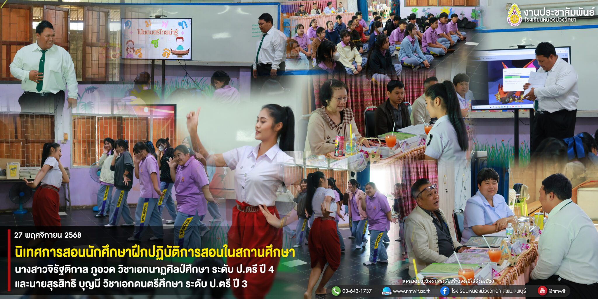 วันพฤหัสบดีที่ 27 ธันวาคม พ.ศ. 2568 นางสาวจิรัฐติกาล ภูอวด วิชาเอกนาฏศิลป์ศึกษา ปริญญาตรีชั้นปีที่ 4 และนายสุรสิทธิ บุญมี วิชาเอกดนตรีศึกษา ปริญญาตรีชั้นปีที่ 3 นักศึกษาฝึกปฏิบัติการสอนในสถานศึกษา จากวิทยาลัยนาฏศิลปลพบุรี รับการนิเทศการปฎิบัติการสอน รอบที่ 1 จากคณาจารย์
