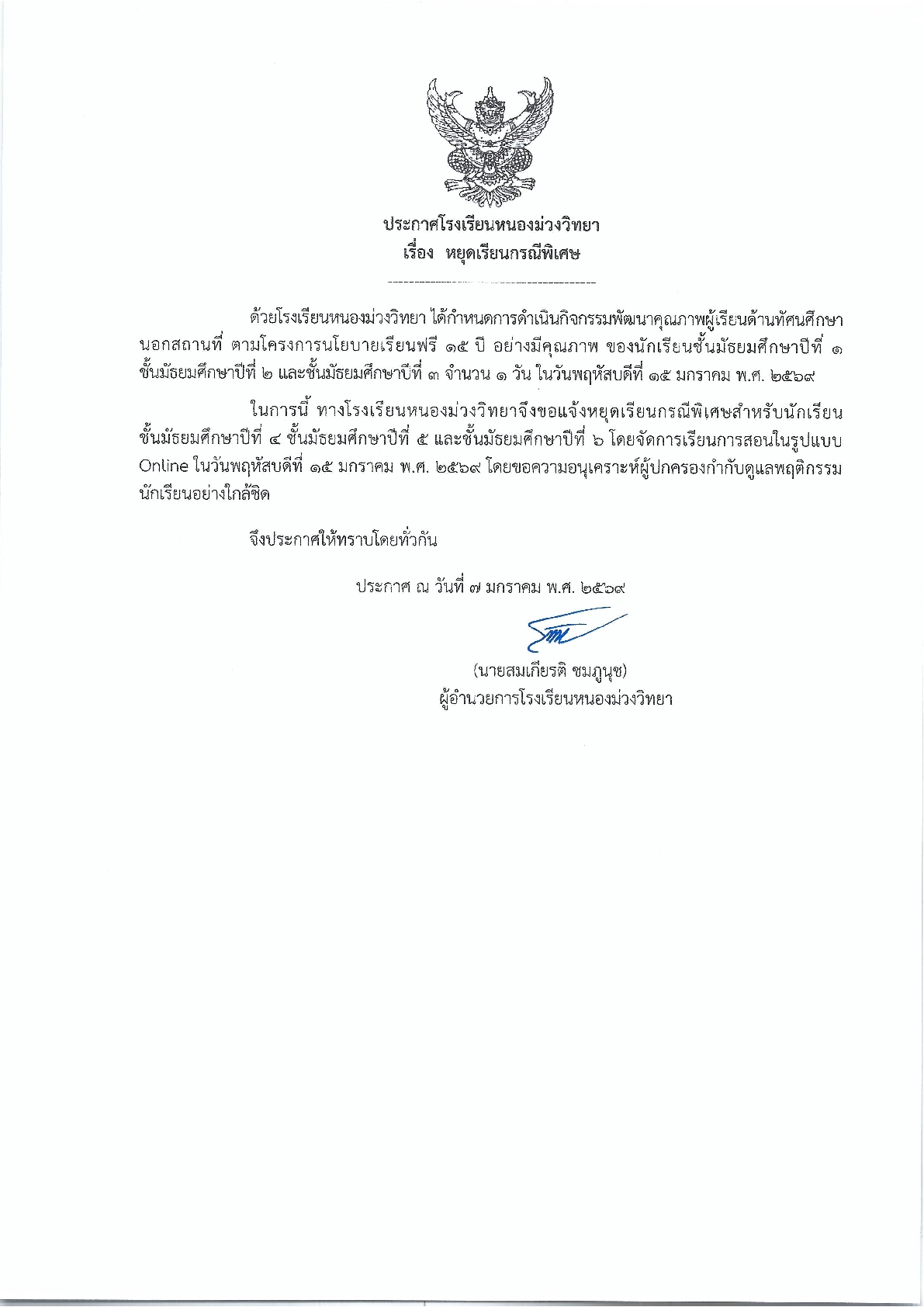 ด้วยโรงเรียนหนองม่วงวิทยา ได้จัดกิจกรรมพัฒนาคุณภาพผู้เรียนทัศนศึกษานอกสถานที่ ประจำปีการศึกษา 2568 ตามโครงการนโยบายเรียนฟรี 15 ปี อย่างมีคุณภาพ สำหรับนักเรียนระดับชั้นมัธยมศึกษาปีที่ 1 – 3 ในวันที่ 15 มกราคม พ.ศ. 2569 ส่วนนักเรียนระดับชั้นมัธยมศึกษาปีที่ 4 – 6 และครูที่ปรึกษาให้จัดการเรียนการสอนในรูปแบบ Online