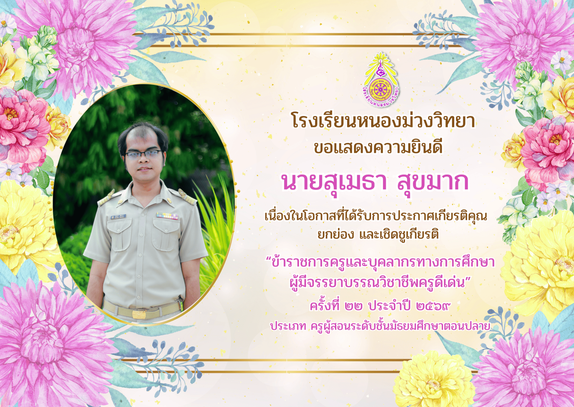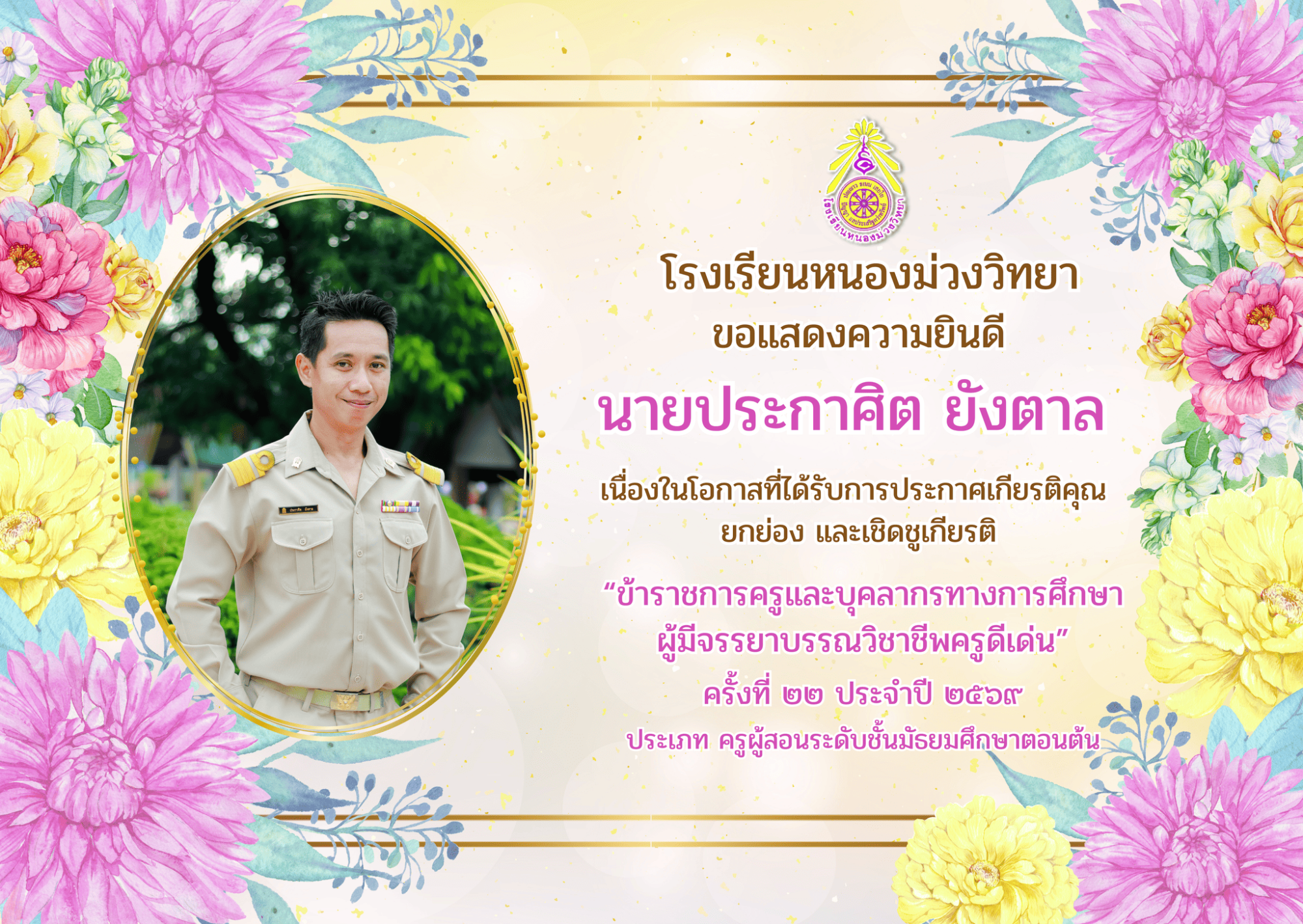 โรงเรียนหนองม่วงวิทยา ขอแสดงความยินดีกับ นายประกาศิต ยังตาล ครูกลุ่มสาระการเรียนรู้การงานอาชีพ และนายสุเมธา สุขมาก ครูกลุ่มสาระการเรียนรู้คณิตศาสตร์ เนื่องในโอกาสที่ได้รับการประกาศเกียรติคุณ ยกย่อง และเชิดชูเกียรติ “ข้าราชการครูและบุคลากรทางการศึกษา ผู้มีจรรยาบรรณวิชาชีพครูดีเด่น” ครั้งที่ 22 ประจำปีพ.ศ. 2569