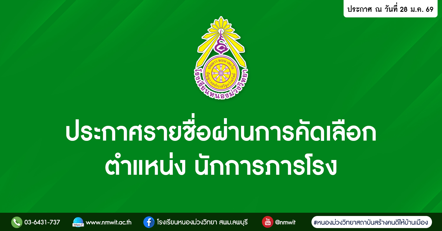 ประกาศโรงเรียนหนองม่วงวิทยา เรื่อง รายชื่อผู้ผ่านการคัดเลือกเพื่อเป็นลูกจ้างชั่วคราว ปฏิบัติหน้าที่ ตำแหน่ง นักการภารโรง