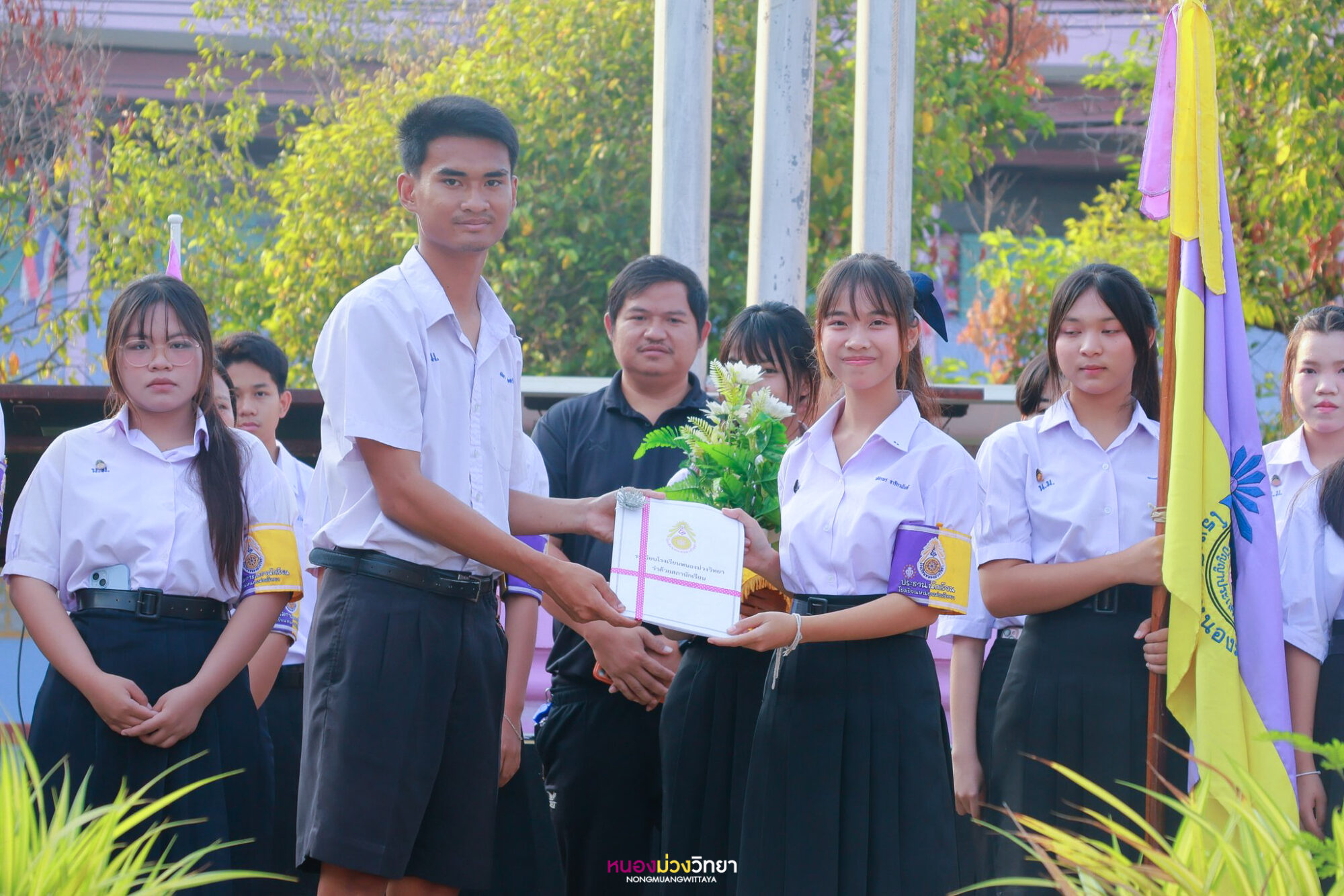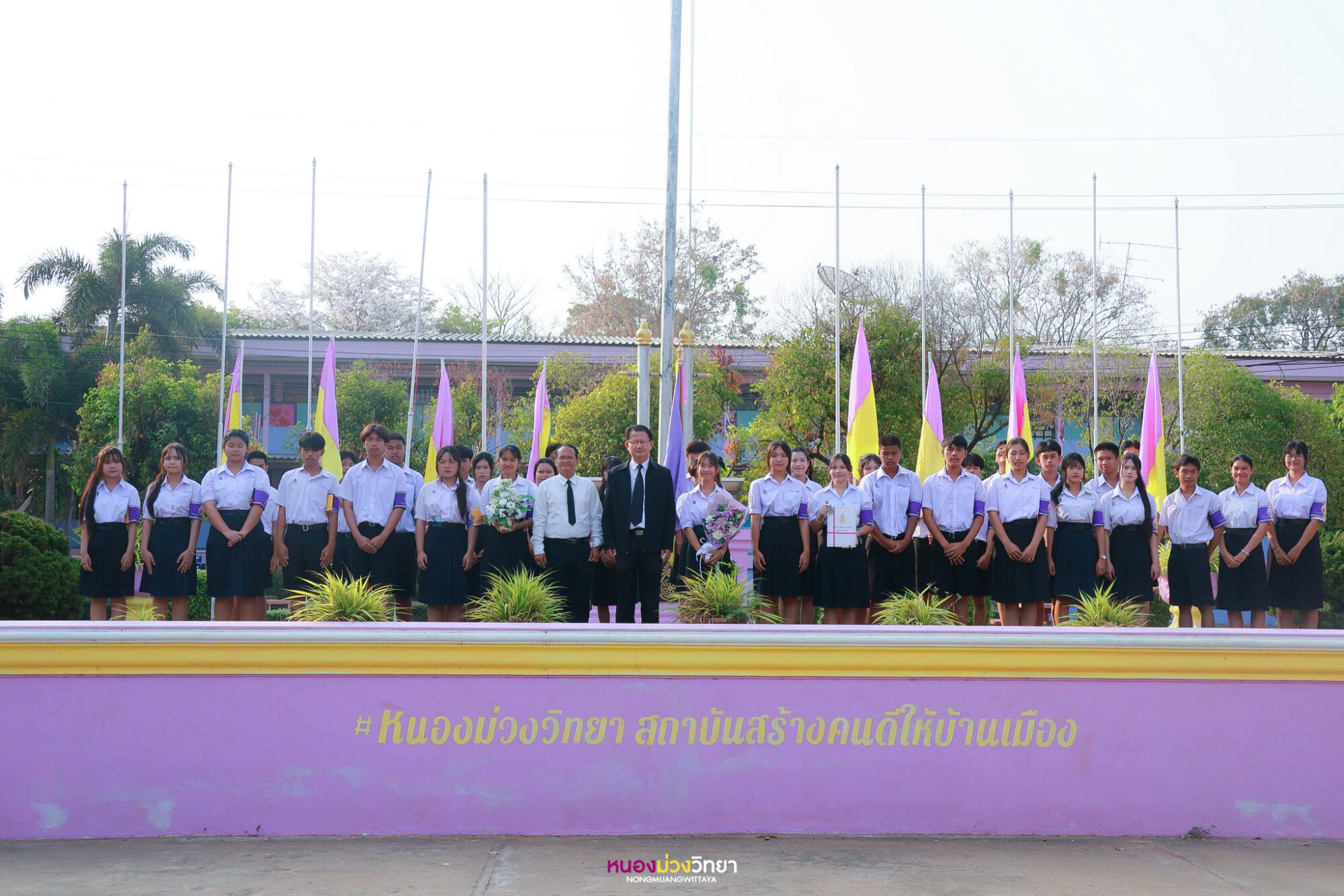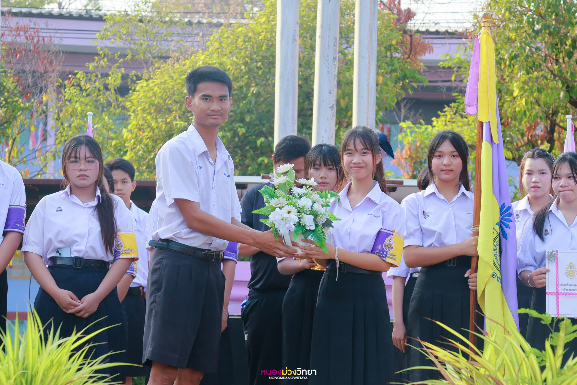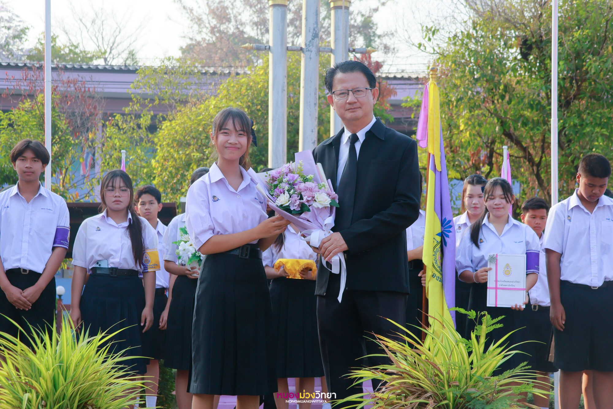 ในการนี้ ผู้อำนวยการโรงเรียนหนองม่วงวิทยา ได้มอบดอกไม้แสดงความยินดีแก่คณะกรรมการสภานักเรียนชุดใหม่ พร้อมให้โอวาทและกำลังใจในการปฏิบัติหน้าที่