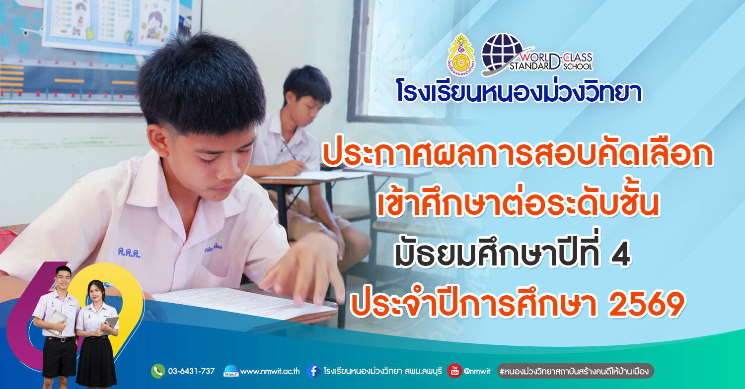 ประกาศโรงเรียนหนองม่วงวิทยา เรื่อง ผลการสอบคัดเลือกเข้าศึกษาต่อระดับชั้นมัธยมศึกษาปีที่ 4 ประจำปีการศึกษา 2569